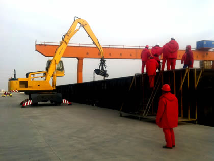 圖中所示:該抓管機(jī)正在進(jìn)行鋼管的卸火車(chē)作業(yè),卸火車(chē)裝汽車(chē)一次完成!鋼管由于太長(zhǎng),抓取時(shí)重心不太好掌握,我公司專(zhuān)門(mén)為其設(shè)計(jì)了專(zhuān)用抓具,便于抓取時(shí)掌握鋼管的重心,大大提高了鋼管的裝卸效率,受到了客戶的稱(chēng)贊。
