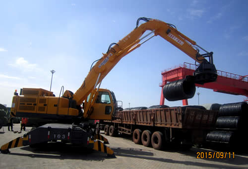 八達(dá)重工雙動(dòng)力抓料機(jī)改進(jìn)后配裝盤圓、鋼卷專用裝卸吊具,應(yīng)用于量大鋼卷、盤圓的裝卸車、裝卸船、貨場的堆碼垛作業(yè)。